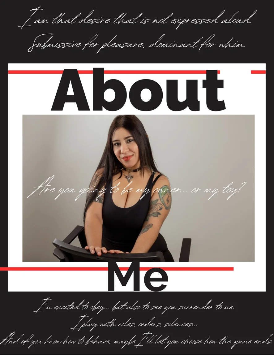 I love role-playing, exploring the limits of pleasure and obedience, and losing myself in the world of BDSM. I'm naturally submissive, but don't be complacent... I also know how to take control if provoked. In my room, there's no judgment, just fantasies that come true. Do you dare to play with me?